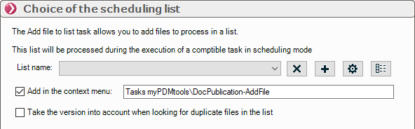 Diese Aufgabe wird die zu verarbeitenden Dateien zu einer ausgewählten Liste hinzufügen (die möglicherweise bereits Dateien enthält, die auf die Verarbeitung warten).