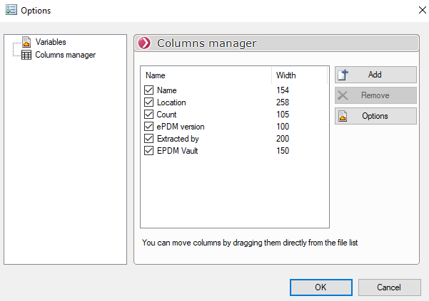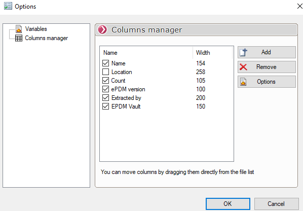 Die Reihenfolge, in der die Spalten angezeigt werden, kann geändert werden, indem sie direkt aus der Dateiliste heraus verschoben werden.