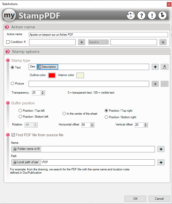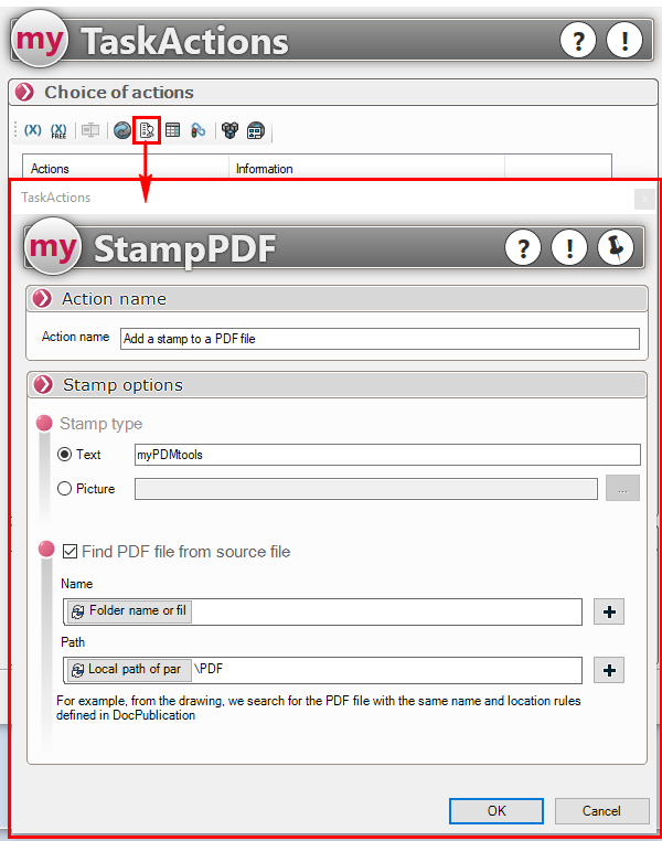 Zur Verwendung von Variablen: Wenn TaskAction auf der Quelldatei gestartet wird, werden die Variablen der Quelldatei verwendet, nicht die der PDF-Datei.