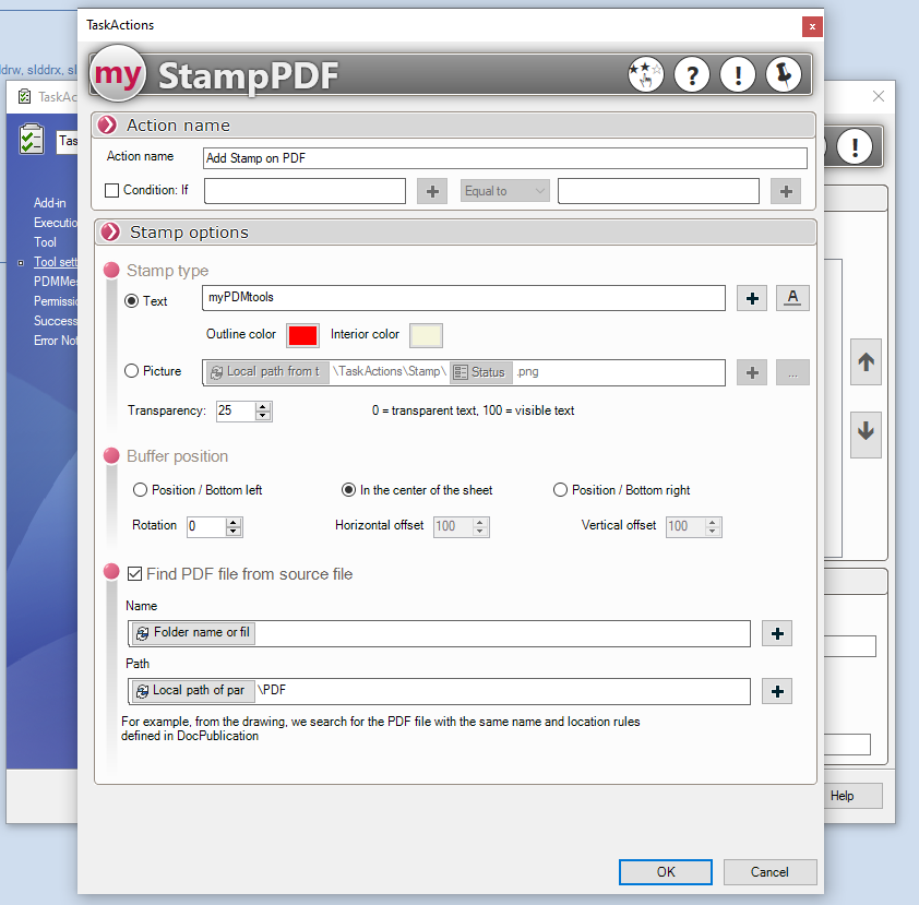 Mit dem Werkzeug TaskActions aus der myPDMtools-Suite können Sie einen Stempel auf ein PDF-Dokument anwenden. Dieser Stempel kann die Form eines Textes oder eines Bildes haben.