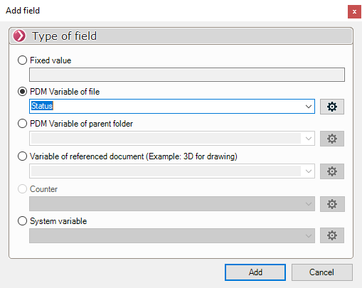 Wir werden einen Stempel vom Typ Bild verwenden und ihn so einstellen, dass er die Variable "Status" des zu verarbeitenden Dokuments verwendet, um das Bild für den Stempel auszuwählen. Sie brauchen nur das + Symbol zu verwenden, um auf das Feldverkettung-Steuerelement myPDMtools: