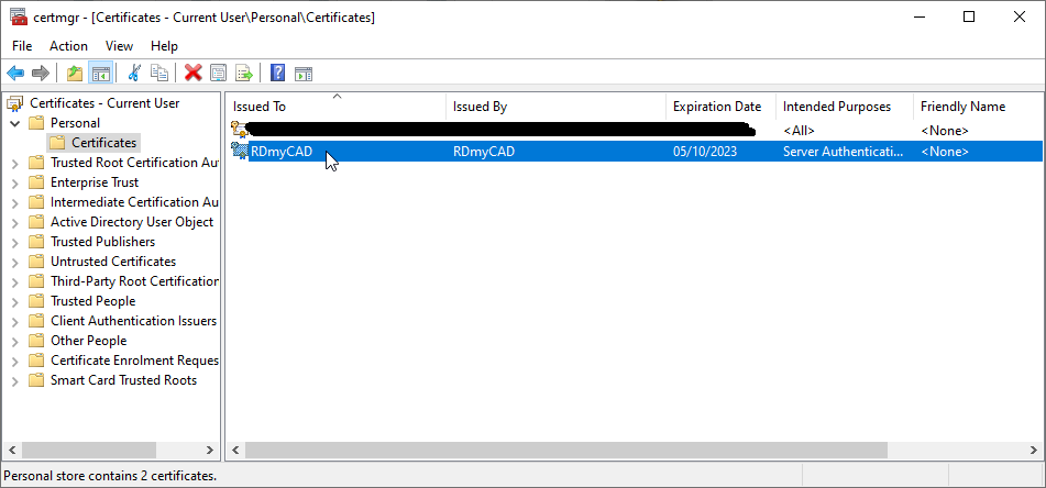 Durchsuchen Sie den persönlichen Zertifikatsordner und doppelklicken Sie auf das zuvor installierte Zertifikat: