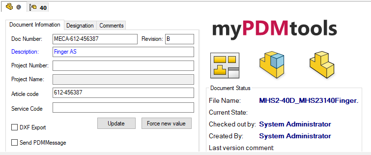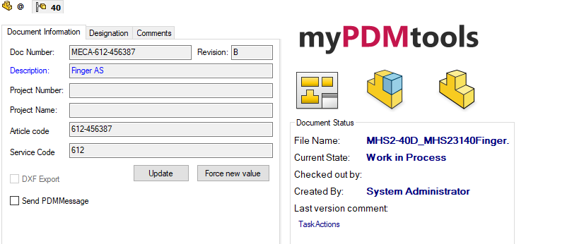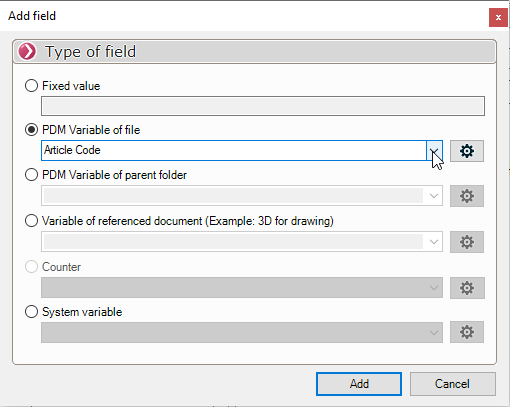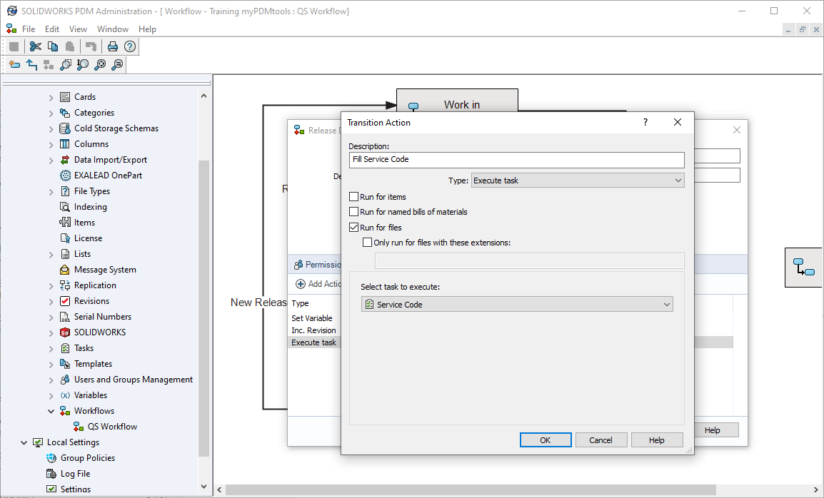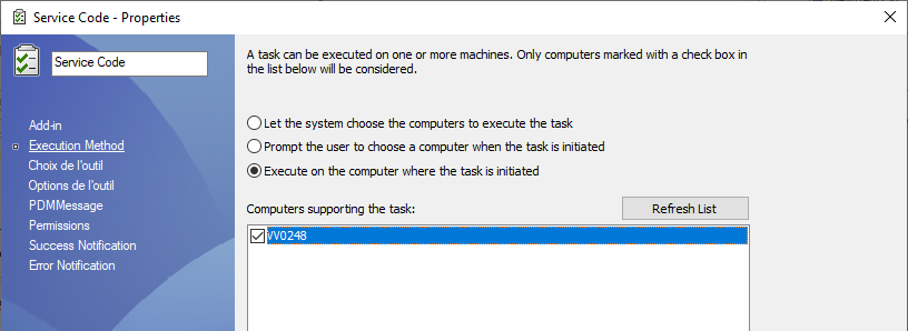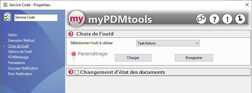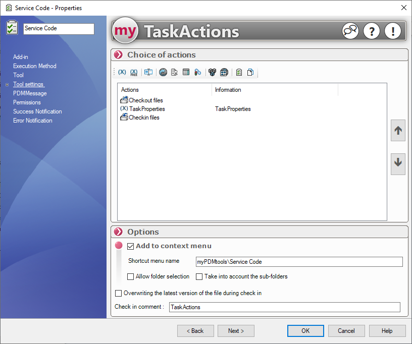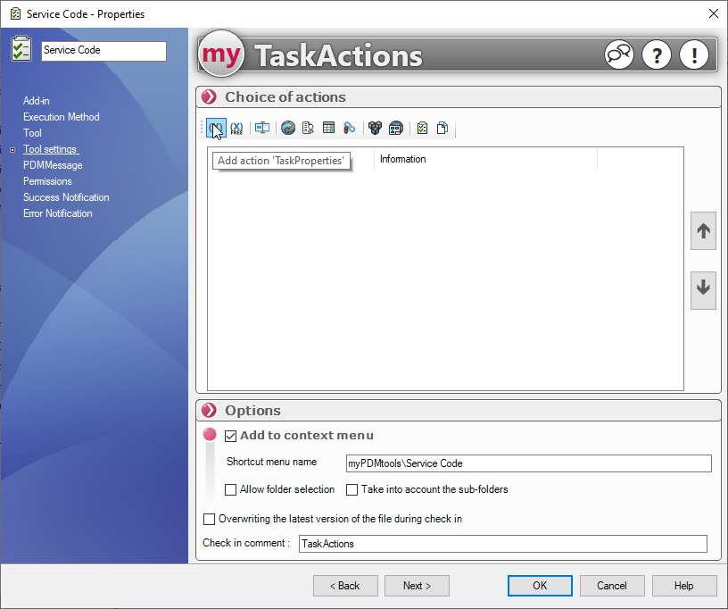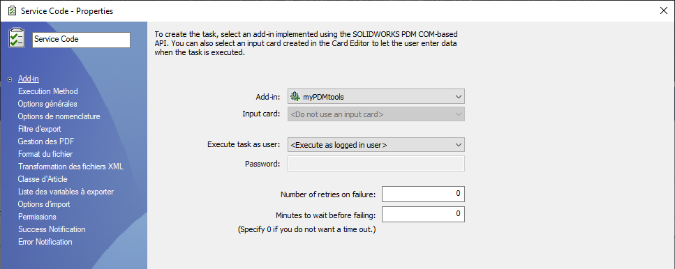 Wir nennen diese Aufgabe Service Code und wählen das Add-In myPDMtools: