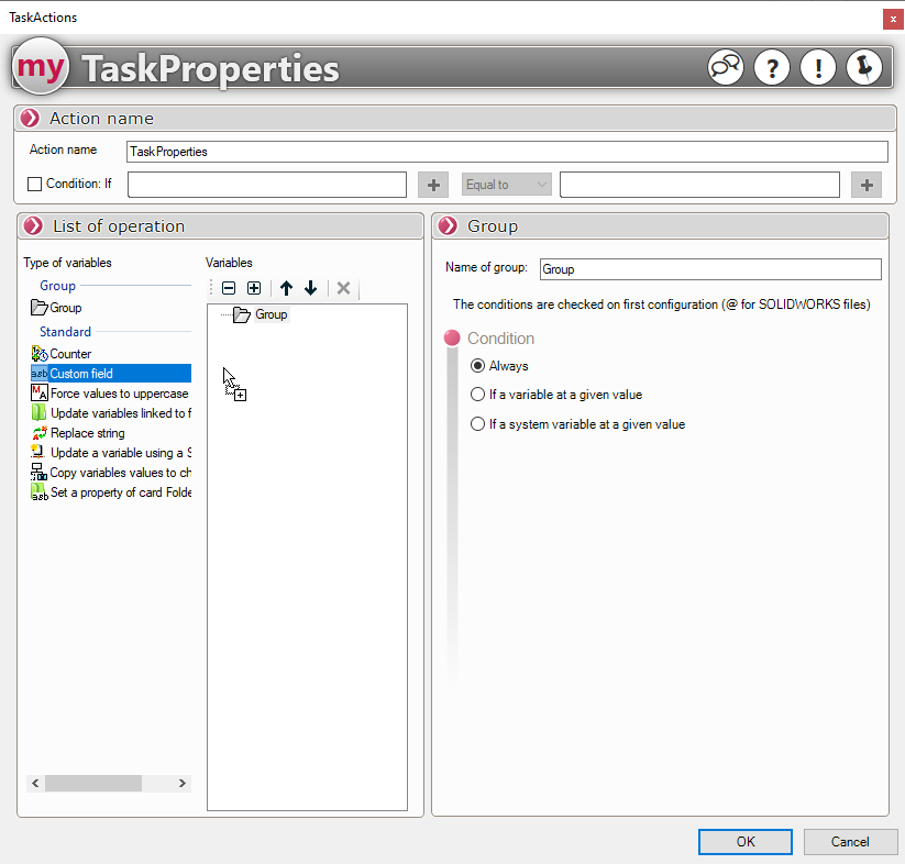 Das Werkzeug TaskActions ermöglicht die automatische Bewertung eines Variablenwerts bei einer Zustandsänderung.