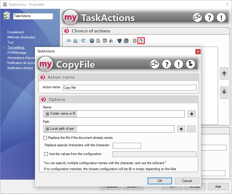 Mit der Aktion CopyFile können Sie eine Datei in die oder aus der Dokumentenverwaltung kopieren, mit der Möglichkeit, sie mithilfe konfigurationsspezifischer Variablen umzubenennen: