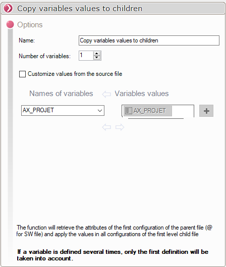 Die Funktion ruft die Attribute der ersten Konfiguration der übergeordneten Datei (@ für SW-Datei) ab und wendet die Werte in allen Konfigurationen der untergeordneten Dateien der ersten Ebene an.
