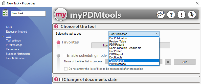 Wenn der ausgewählte Zusatz myPDMtoolsWenn Sie sich für eine der beiden Möglichkeiten entscheiden, müssen Sie das Werkzeug definieren, das Sie verwenden möchten.