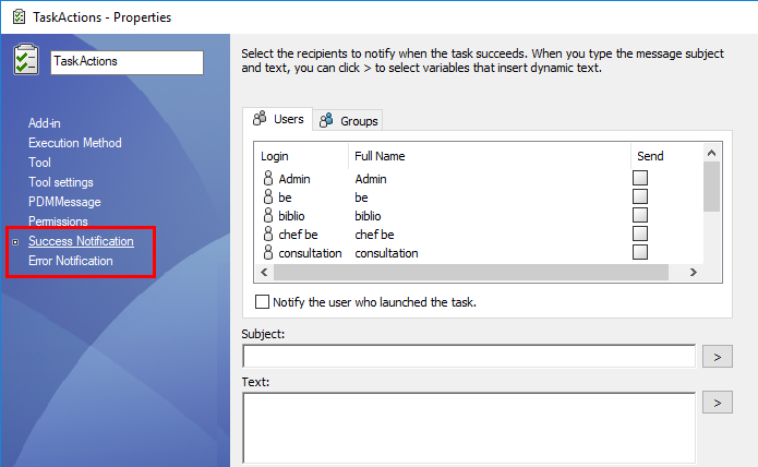 Mit diesem Formular können Sie Folgendes konfigurieren Fehler- und Erfolgsbenachrichtigungen: Man wählt die Gruppen und Benutzer aus, die im Erfolgsfall bei der Ausführung der Aufgabe benachrichtigt werden sollen, sowie den Betreff und den Textkörper der Nachricht.
