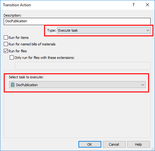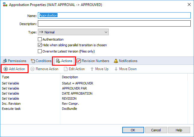 myPDMtools-Aufgaben Einsetzen bei Staatswechseln Über den Übergang Genehmigung fügen wir die Aktion DocPublication oder wählen Sie die Aufgabe, die Sie ausführen möchten. Dazu fügen wir eine neue Aktion hinzu