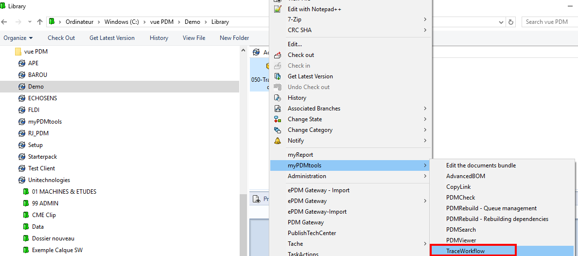 Der Rechtsklick auf eine Datei bringt dann das Werkzeug TraceWorkflow zum Vorschein.