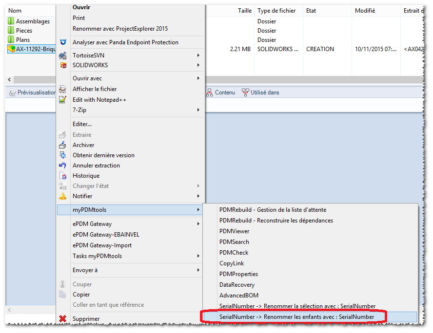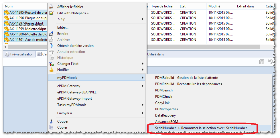 Par exemple lors de la sélection d'un assemblage on renommera tous ce que l'on retrouve dans 'Contenu' et dans 'Utilisé dans' récursivement