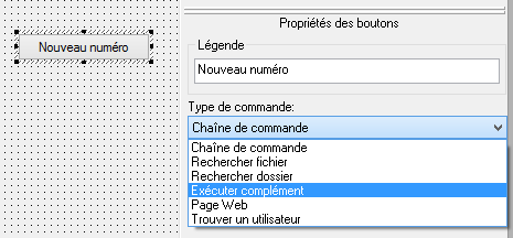 - Ajouter un bouton dans la carte et choisir le type de commande Exécuter complément.