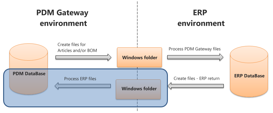 Die folgende Abbildung erklärt die Funktionsweise von PDM Gateway, wenn das Tool Rückmeldungen aus dem ERP verarbeitet.