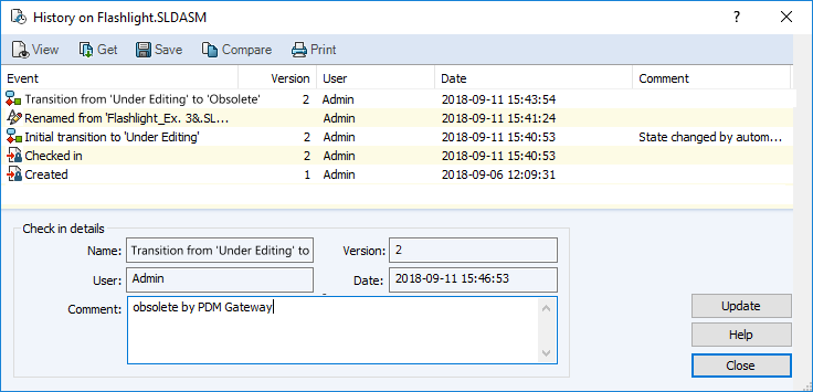 Diese Aktion wird dann in der Historie des Dokuments sichtbar.