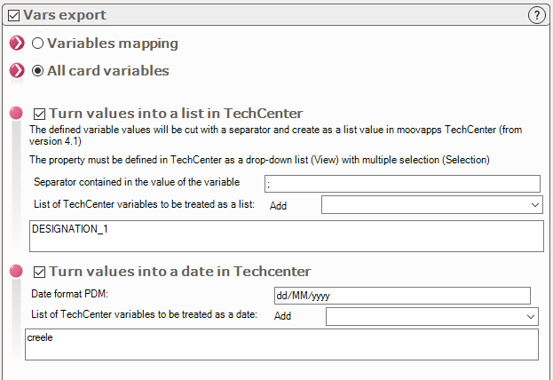 Der Variablenexport ermöglicht es, die Werte der PDM-Attribute von Dokumenten in Moovapps TechCenter zu veröffentlichen.
