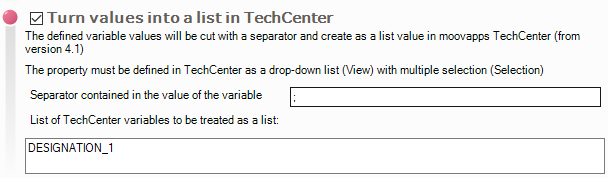 Mit dieser Option können Sie einen Eigenschaftswert, der mit einem Trennzeichen definiert ist, in Moovapps TechCenter in eine Liste umwandeln.