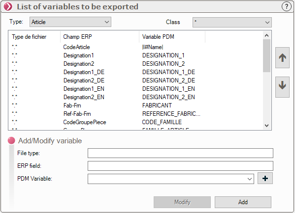 - Artikel: Ermöglicht es Ihnen, die PDM-Variablen festzulegen, die für jeden Artikel exportiert werden sollen.