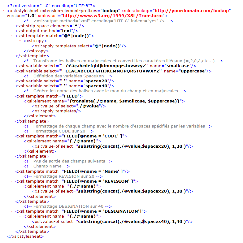 Dieser Bildschirm bietet ein Beispiel für eine XSL-Transformationsdatei, die aus einer XML-Exportdatei für Artikel eine Textausgabedatei im festen Format erstellt.