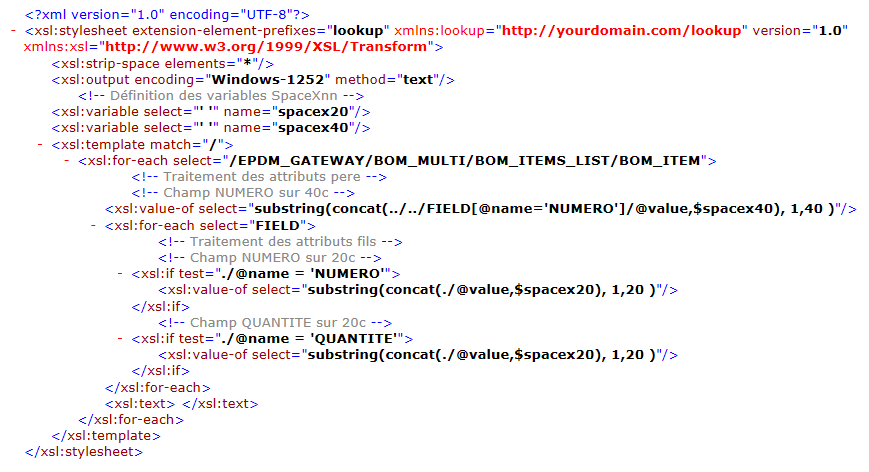 Dieser Bildschirm bietet ein Beispiel für eine XSL-Transformationsdatei, die aus einer Exportdatei für die Stückliste im XML-Format eine Textausgabedatei im festen Format erstellt.