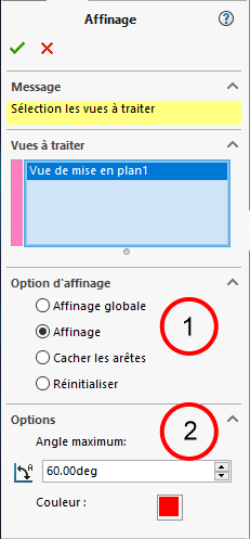 Affinage Paramétrage Ce module permet, en mise en plan, d’affiner certaines arêtes conformément aux usages dans le monde horloger. Choix de l’action à réaliser. Définition des paramètres et de la couleur des arêtes à prendre en compte.