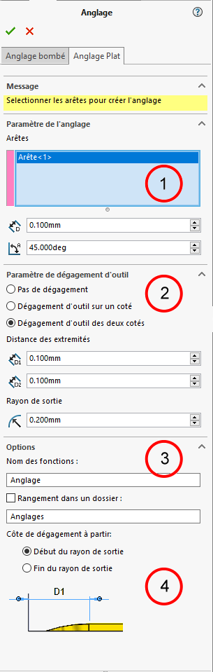 Ce module permet d’angler les arêtes des pièces existantes. Le PropertyManager offre 2 onglets permettant de choisir un "Anglage plat" (par extrusion) ou un "Anglage bombé" (par balayage).