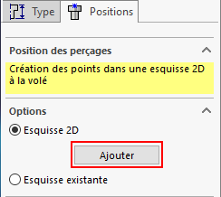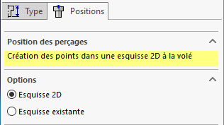 On peut soit sélectionner une esquisse existante (2D ou 3D), soit piquer à la volée les points de positionnement des perçages. Dans ce cas tous les points devront être sur le même plan.