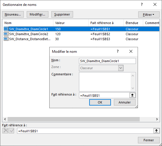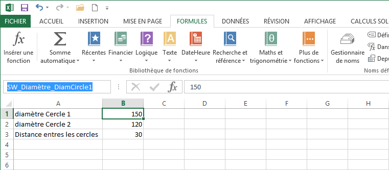 Il faut Nommer les cellules Excel, pour que celles-ci soient reconnues comme variables globales lors de l’insertion du fichier dans SOLIDWORKS. La syntaxe doit être la suivante :