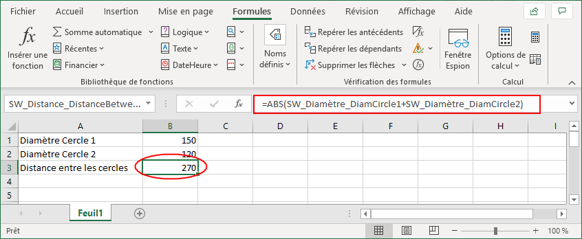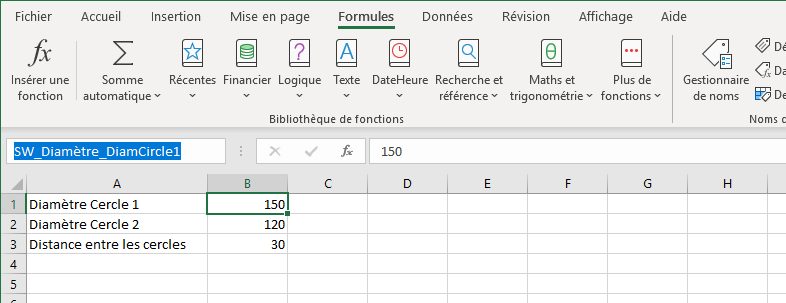 Les cellules peuvent comporter des opérations entre elles, comme par exemple ici la distance entre les cercles est le résultat de la différences des 2 diamètres.