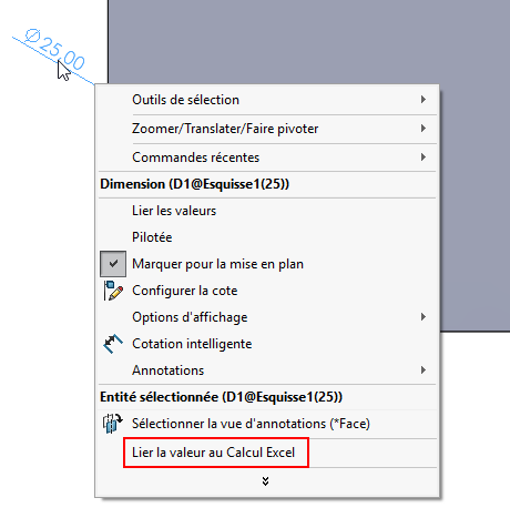 Lier la valeur au Calcul Excel - Par un clic droit sur une cote, le menu contextuel propose une nouvelle option afin de permettre de lier la cote à une variable globale.