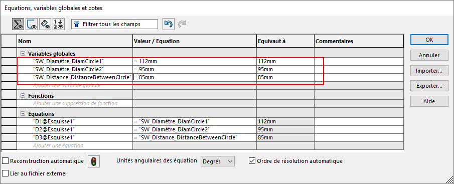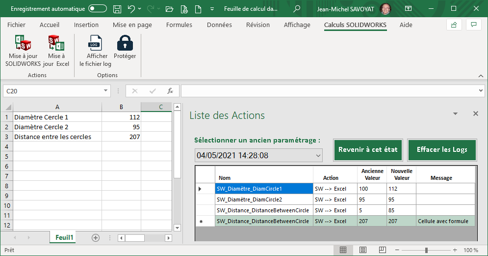 Nous pouvons remarquer dans le fichier log que la variable pilotant le diamètre1 est bien passée de 100mm à 112mm, que la valeur du diamètre2 est restée inchangée et surtout que la valeur pilotant l'entraxe des cercles n'a pas été modifiée car la cellule est pilotée par une formule Excel (commentaire dans la colonne Message). En effet les cellules contenant des valeurs définies par des formules ne sont pas écrasées par la valeur provenant du document SOLIDWORKS.