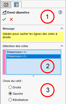 En fonction de l'orientation des vues, la notion de "Droite" ou "Gauche" peut être appliquée sur "Haut" ou "Bas". Les cotes linéaires peuvent également être sélectionnées.