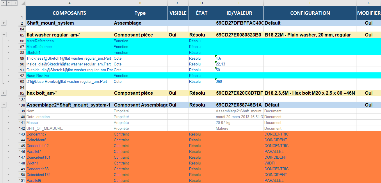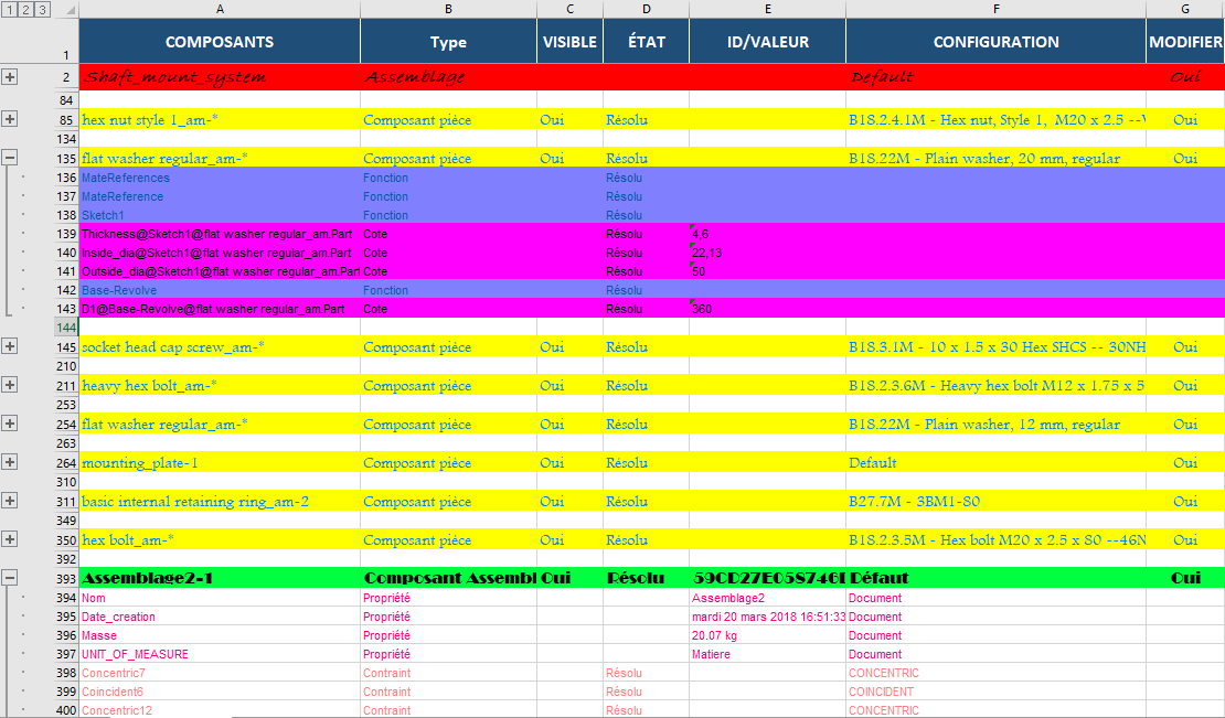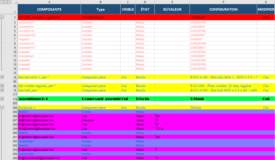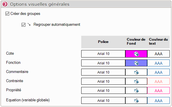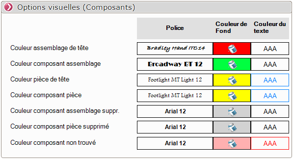C'est dans cette partie que nous allons paramétrer l'aspect graphique pour chaque type de composants : Il est possible ici de modifier la couleur des cellules correspondant aux différents types de composants (pièce, assemblage, composants non trouvés ou à l'état supprimé, cotes, contraintes, etc...).