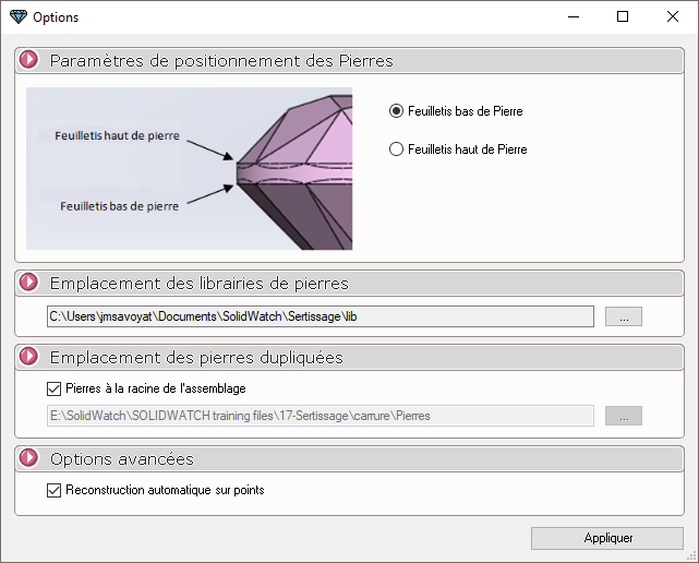 - L'emplacement pour dupliquer les pierres insérées dans les assemblages depuis la librairie. Les pierres peuvent être sauvegardées dans un répertoire situé à la racine du document assemblage.
