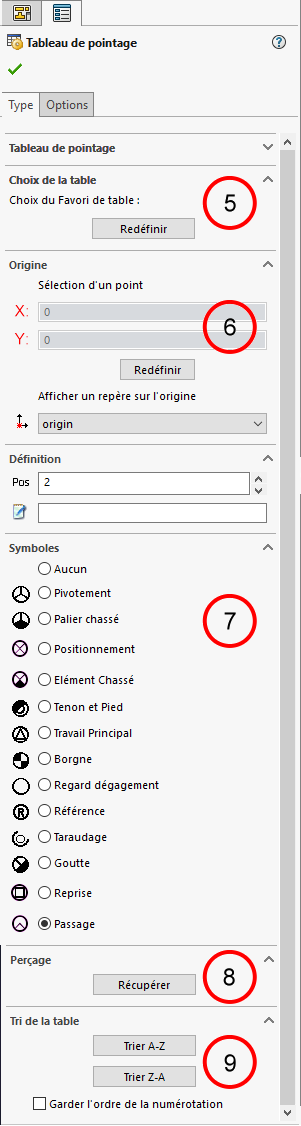 En cliquant dans cette zone vous pouvez redéfinir le point d’origine si celui-ci doit être modifié. Les coordonnées de pointage dans le tableau seront recalculées en appuyant sur la fonction « Reconstruire » de SOLIDWORKS ou en appuyant sur les touches « Ctrl + Q » du clavier.