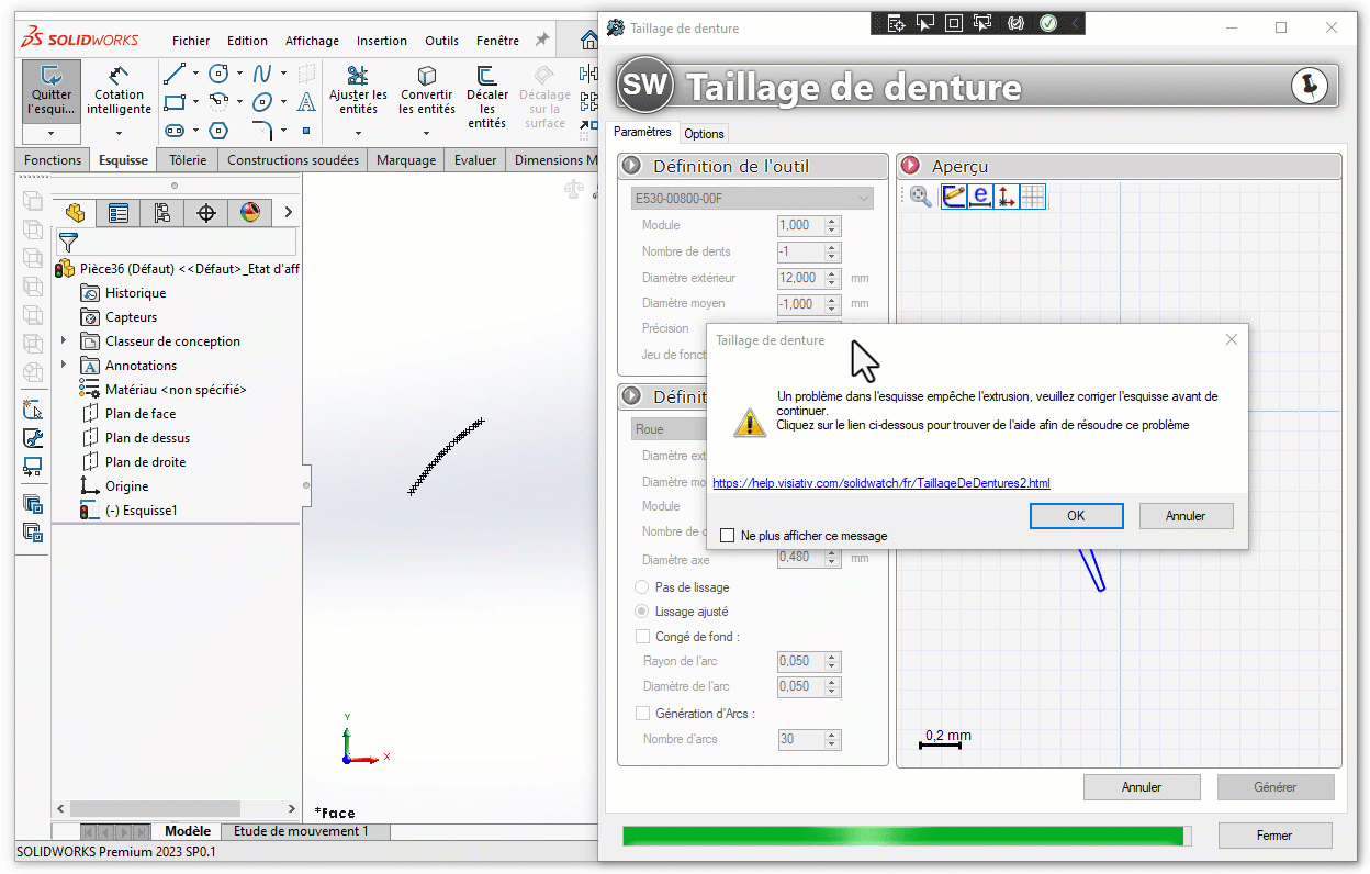 Taillage de dentures Correction du profil Méthode de résolution du message d'erreur lors de la création d'un engrenage :